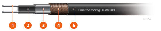 Samoregulační kabel s výkonem 10 W/m při 10 °C nebo Line™ SamoregF 10 W/10 °C *. Písmeno F znamená fluorpolymerovou (teflonovou) izolaci. Kabel je vhodný do agresivního prostředí.
